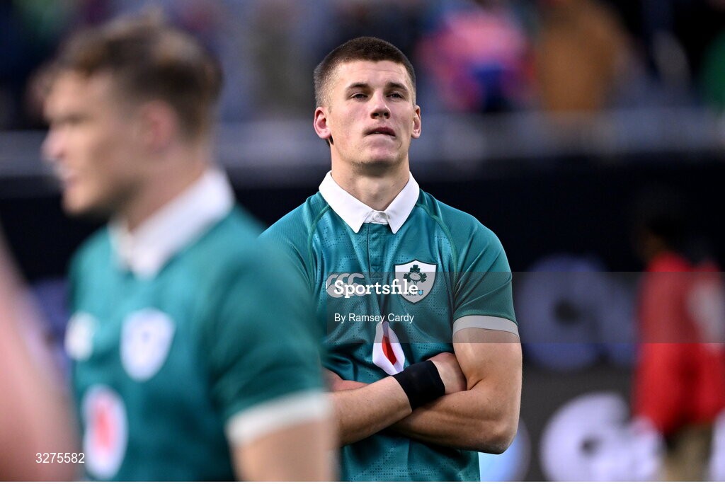 1 November 2025; Sam Prendergast of Ireland reacts after the Gallagher Cup match between Ireland and New Zealand at Soldier Field in Chicago, USA. Photo by Ramsey Cardy/Sportsfile