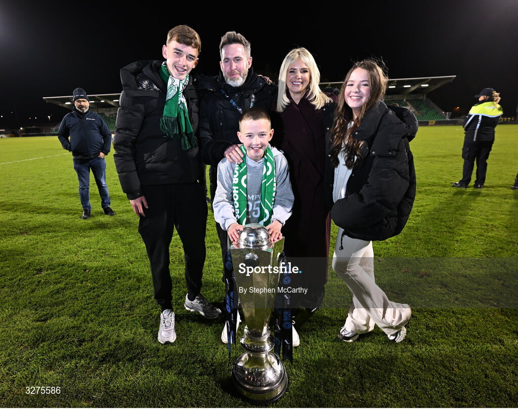 1 November 2025; Shamrock Rovers manager Stephen Bradley and family, from left, sons Jayden and Josh, wife Emma, and daughter Ella celebrate with the SSE Airtricity Men's Premier Division trophy after the SSE Airtricity Men's Premier Division match between Shamrock Rovers and Sligo Rovers at Tallaght Stadium in Dublin. Photo by Stephen McCarthy/Sportsfile