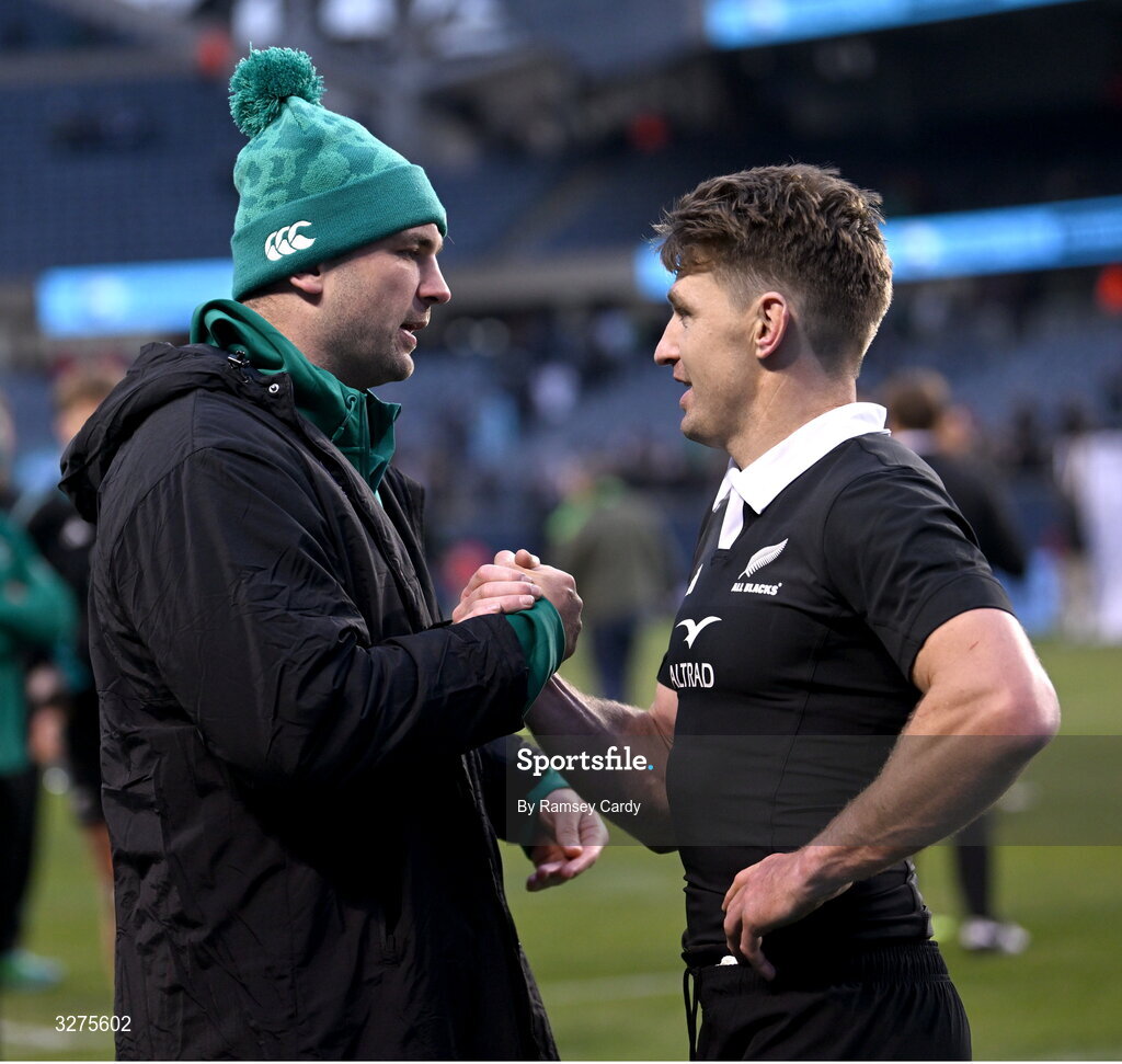 1 November 2025; Tadhg Beirne of Ireland and Beauden Barrett of New Zealand after the Gallagher Cup match between Ireland and New Zealand at Soldier Field in Chicago, USA. Photo by Ramsey Cardy/Sportsfile
