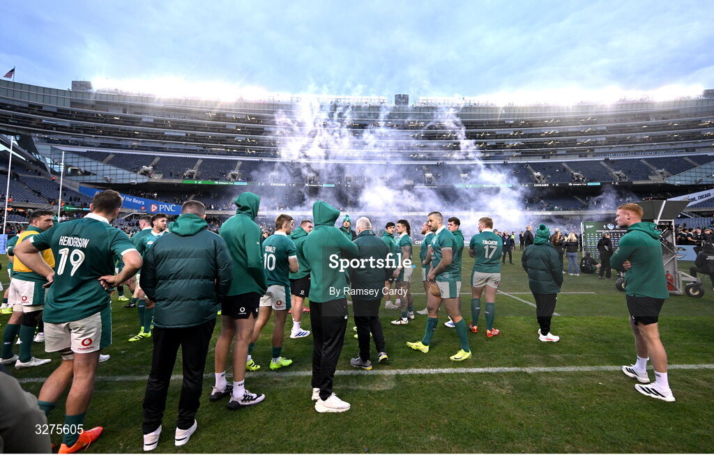 1 November 2025; Ireland players watch the trophy presentation after the Gallagher Cup match between Ireland and New Zealand at Soldier Field in Chicago, USA. Photo by Ramsey Cardy/Sportsfile