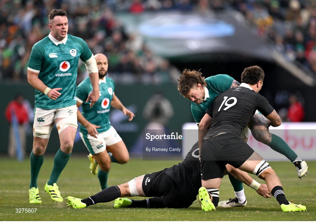 1 November 2025; Andrew Porter of Ireland is tackled by Simon Parker, left, and Josh Lord of New Zealand during the Gallagher Cup match between Ireland and New Zealand at Soldier Field in Chicago, USA. Photo by Ramsey Cardy/Sportsfile
