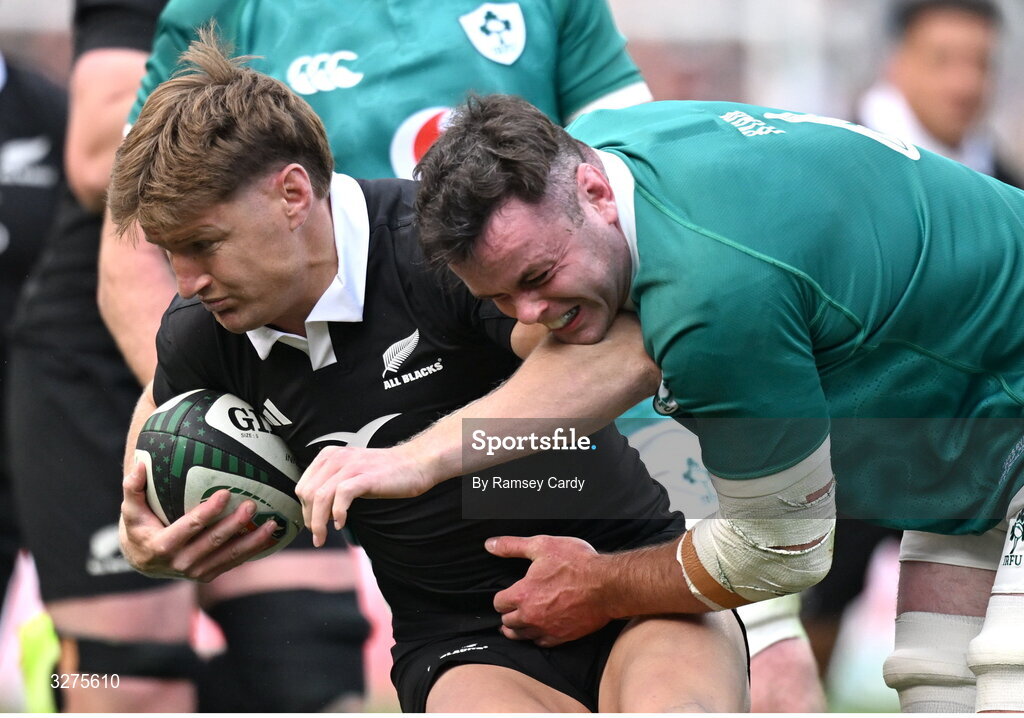 1 November 2025; Jordie Barrett of New Zealand is tackled by James Ryan of Ireland during the Gallagher Cup match between Ireland and New Zealand at Soldier Field in Chicago, USA. Photo by Ramsey Cardy/Sportsfile