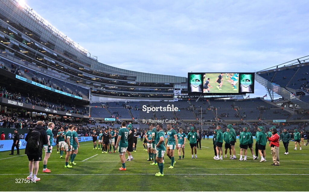 1 November 2025; Ireland players after the Gallagher Cup match between Ireland and New Zealand at Soldier Field in Chicago, USA. Photo by Ramsey Cardy/Sportsfile
