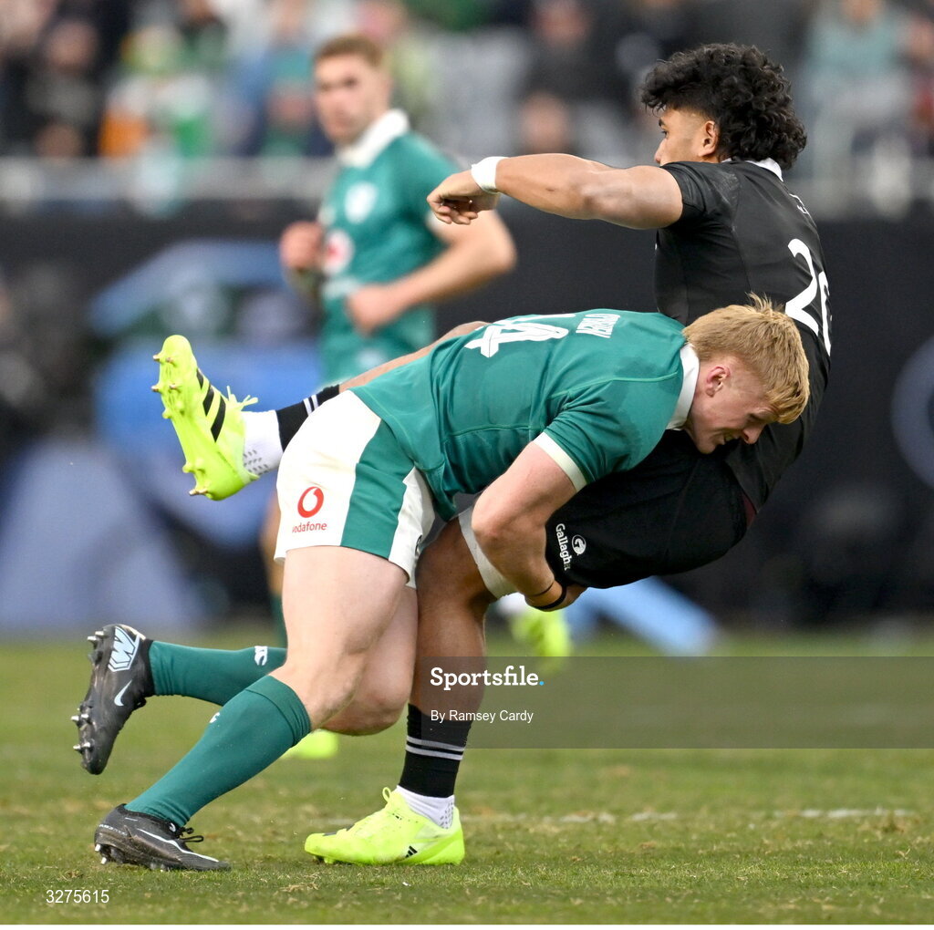 1 November 2025; Tommy O'Brien of Ireland in action against Wallace Sititi of New Zealand during the Gallagher Cup match between Ireland and New Zealand at Soldier Field in Chicago, USA. Photo by Ramsey Cardy/Sportsfile