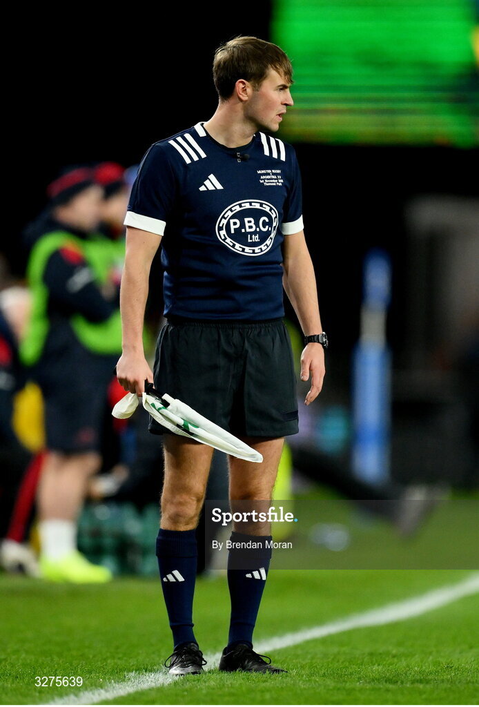 1 November 2025; Assistant referee Jack MacNeice during the tour match between Munster and Argentina XV at Thomond Park in Limerick. Photo by Brendan Moran/Sportsfile