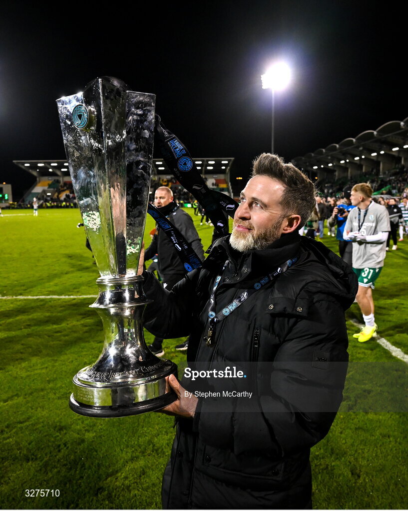 1 November 2025; Shamrock Rovers manager Stephen Bradley celebrates with the SSE Airtricity Men's Premier Division trophy after the SSE Airtricity Men's Premier Division match between Shamrock Rovers and Sligo Rovers at Tallaght Stadium in Dublin. Photo by Stephen McCarthy/Sportsfile