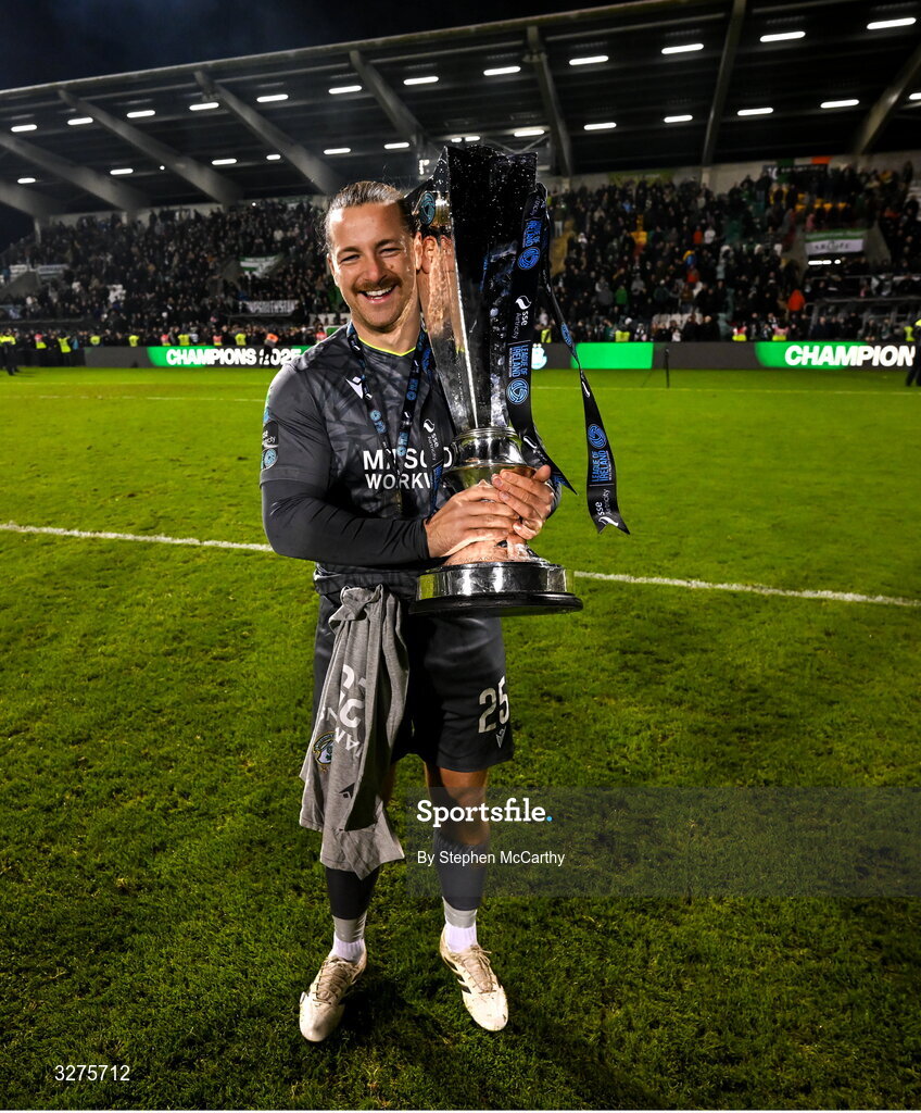 1 November 2025; Shamrock Rovers goalkeeper Lee Stacey celebrates with the SSE Airtricity Men's Premier Division trophy after the SSE Airtricity Men's Premier Division match between Shamrock Rovers and Sligo Rovers at Tallaght Stadium in Dublin. Photo by Stephen McCarthy/Sportsfile