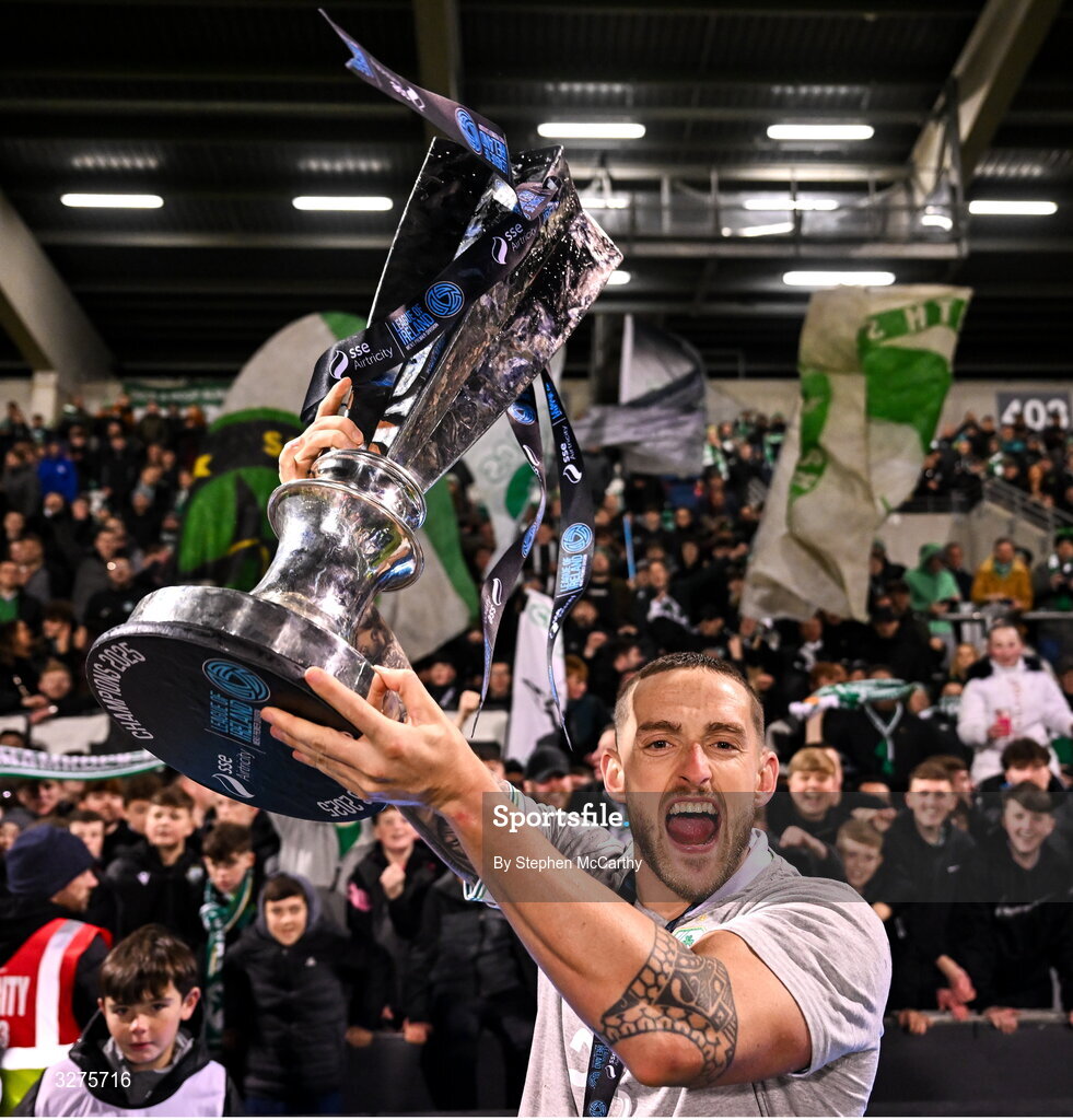 1 November 2025; Lee Grace of Shamrock Rovers celebrates with the SSE Airtricity Men's Premier Division trophy after the SSE Airtricity Men's Premier Division match between Shamrock Rovers and Sligo Rovers at Tallaght Stadium in Dublin. Photo by Stephen McCarthy/Sportsfile