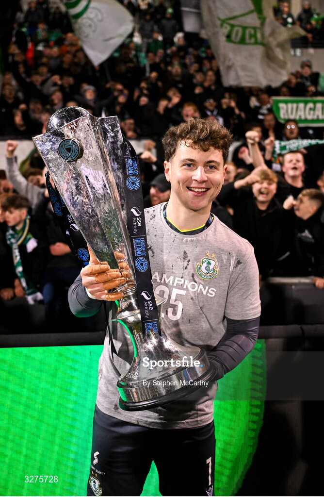 1 November 2025; Shamrock Rovers goalkeeper Ed McGinty celebrates with the SSE Airtricity Men's Premier Division trophy after the SSE Airtricity Men's Premier Division match between Shamrock Rovers and Sligo Rovers at Tallaght Stadium in Dublin. Photo by Stephen McCarthy/Sportsfile