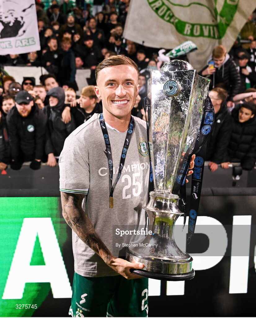 1 November 2025; Danny Grant of Shamrock Rovers celebrates with the SSE Airtricity Men's Premier Division trophy after the SSE Airtricity Men's Premier Division match between Shamrock Rovers and Sligo Rovers at Tallaght Stadium in Dublin. Photo by Stephen McCarthy/Sportsfile