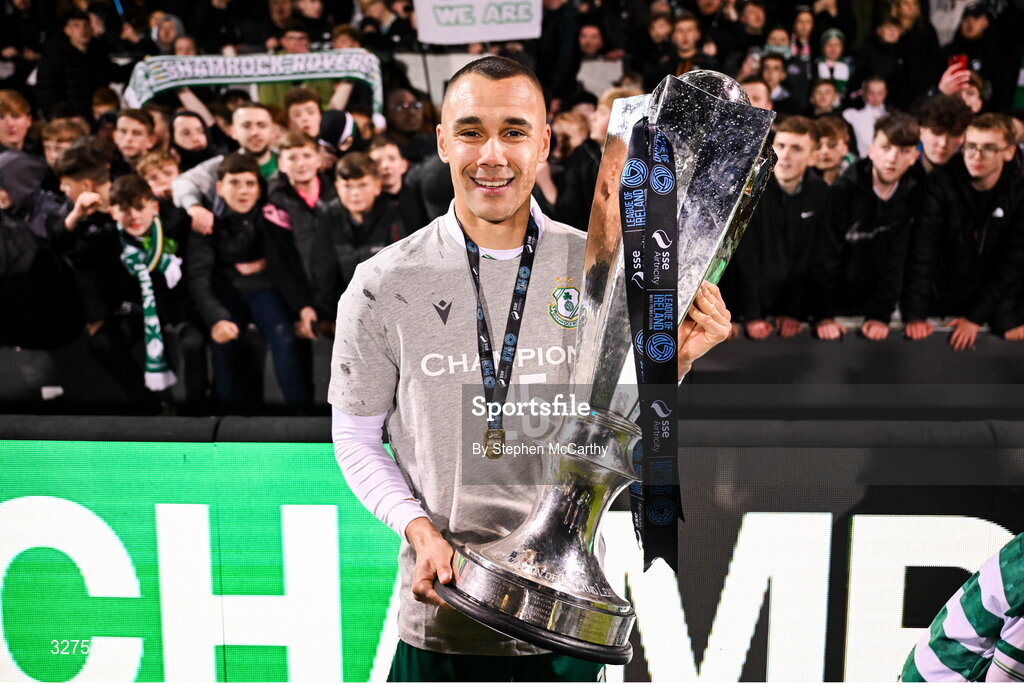 1 November 2025; Graham Burke of Shamrock Rovers celebrates with the SSE Airtricity Men's Premier Division trophy after the SSE Airtricity Men's Premier Division match between Shamrock Rovers and Sligo Rovers at Tallaght Stadium in Dublin. Photo by Stephen McCarthy/Sportsfile