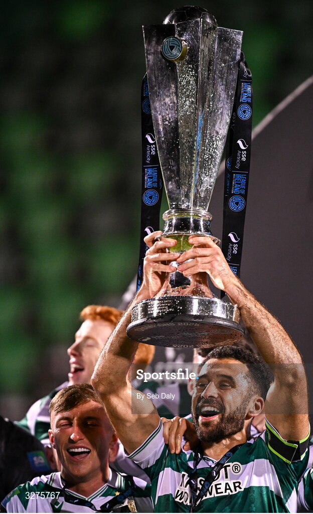 1 November 2025; Shamrock Rovers captain Roberto Lopes lifts the SSE Airtricity Men's Premier Division trophy after the SSE Airtricity Men's Premier Division match between Shamrock Rovers and Sligo Rovers at Tallaght Stadium in Dublin. Photo by Seb Daly/Sportsfile