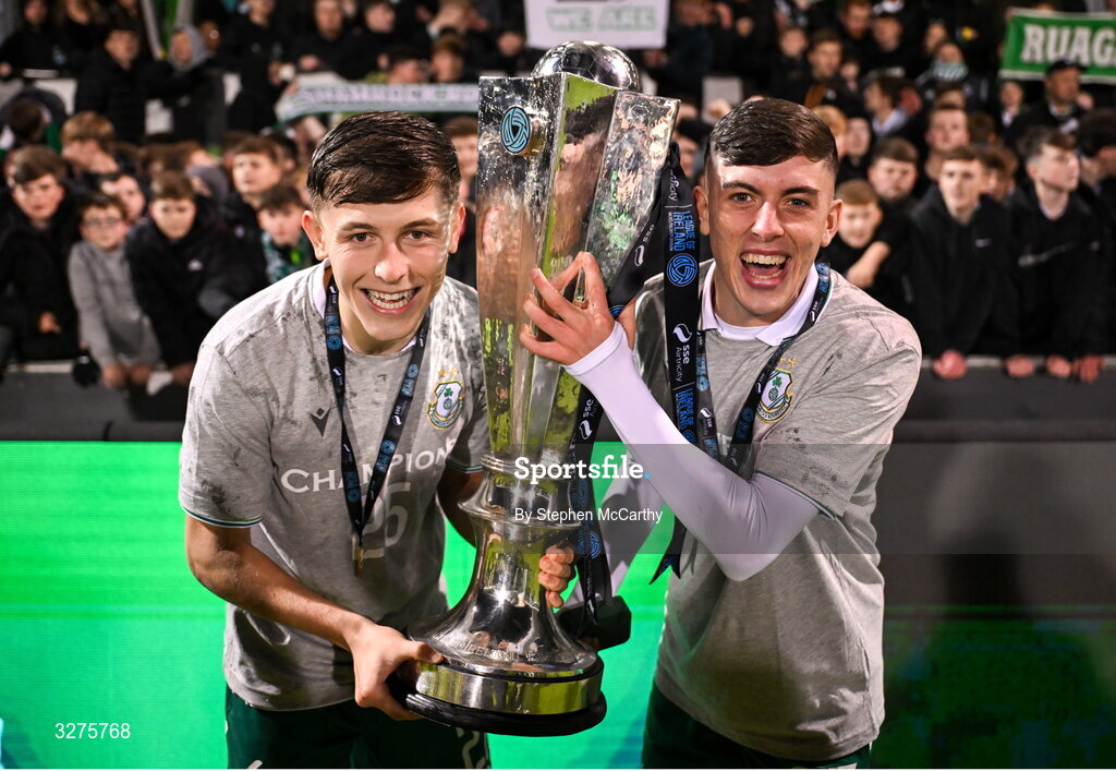 1 November 2025; Cian Barrett, left, and Cory O'Sullivan of Shamrock Rovers celebrate with the SSE Airtricity Men's Premier Division trophy after the SSE Airtricity Men's Premier Division match between Shamrock Rovers and Sligo Rovers at Tallaght Stadium in Dublin. Photo by Stephen McCarthy/Sportsfile