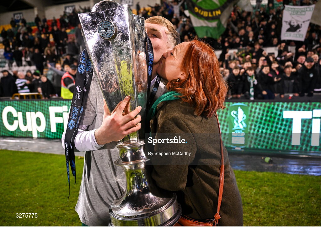 1 November 2025; Michael Noonan of Shamrock Rovers and his mother Sandie celebrate with the SSE Airtricity Men's Premier Division trophy after the SSE Airtricity Men's Premier Division match between Shamrock Rovers and Sligo Rovers at Tallaght Stadium in Dublin. Photo by Stephen McCarthy/Sportsfile