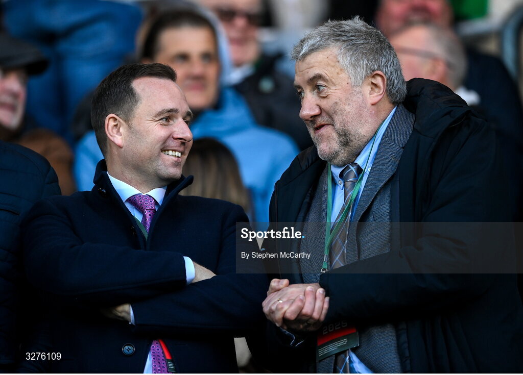1 November 2025; League of Ireland director Mark Scanlon and FAI President Paul Cooke, right, before the SSE Airtricity Men's Premier Division match between Shamrock Rovers and Sligo Rovers at Tallaght Stadium in Dublin. Photo by Stephen McCarthy/Sportsfile