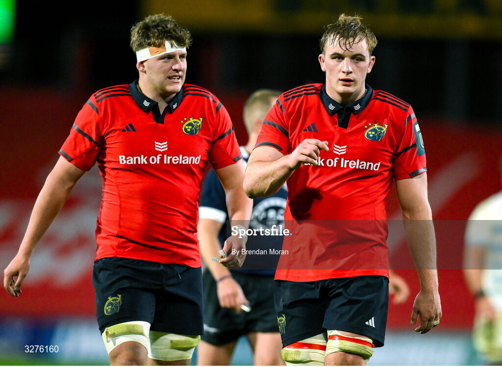 1 November 2025; Gavin Coombes, right, and Luke Murphy of Munster during the tour match between Munster and Argentina XV at Thomond Park in Limerick. Photo by Brendan Moran/Sportsfile