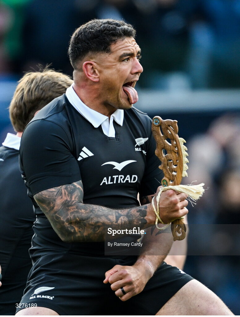 1 November 2025; Codie Taylor of New Zealand performs the Haka before the Gallagher Cup match between Ireland and New Zealand at Soldier Field in Chicago, USA. Photo by Ramsey Cardy/Sportsfile