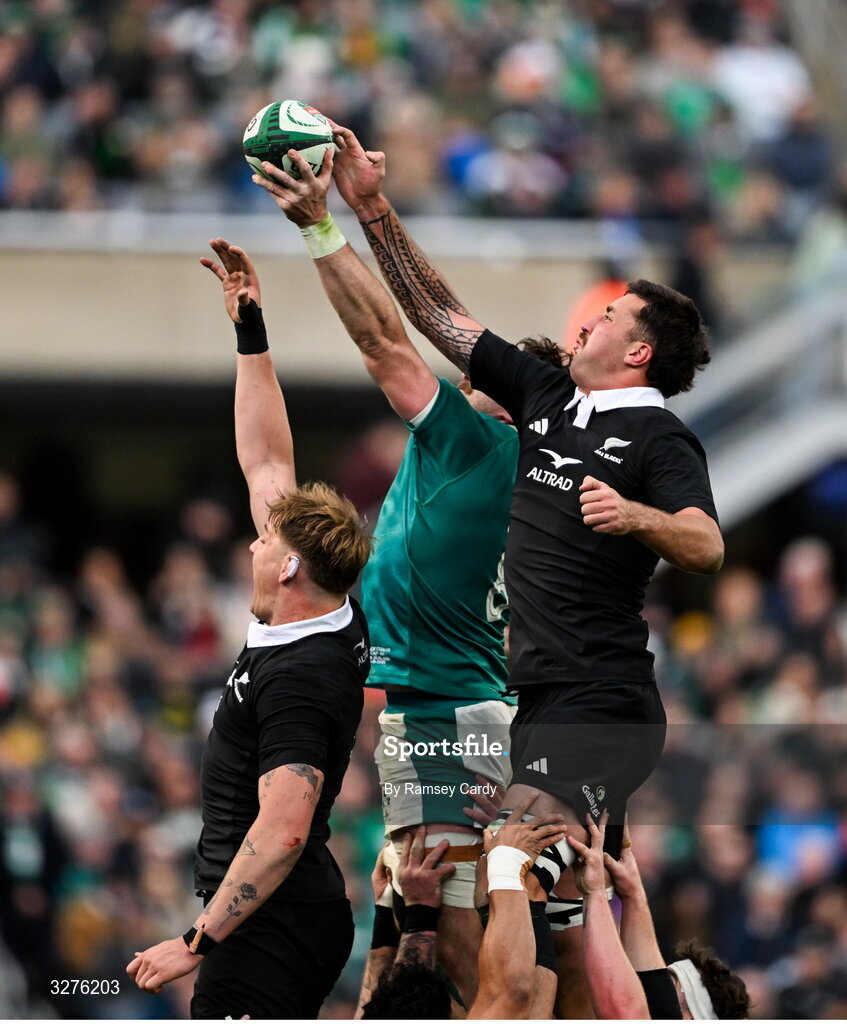 1 November 2025; Jack Conan of Ireland wins possession in the lineout against Fabian Holland, left, and Josh Lord of New Zealand during the Gallagher Cup match between Ireland and New Zealand at Soldier Field in Chicago, USA. Photo by Ramsey Cardy/Sportsfile Photo by Ramsey Cardy/Sportsfile