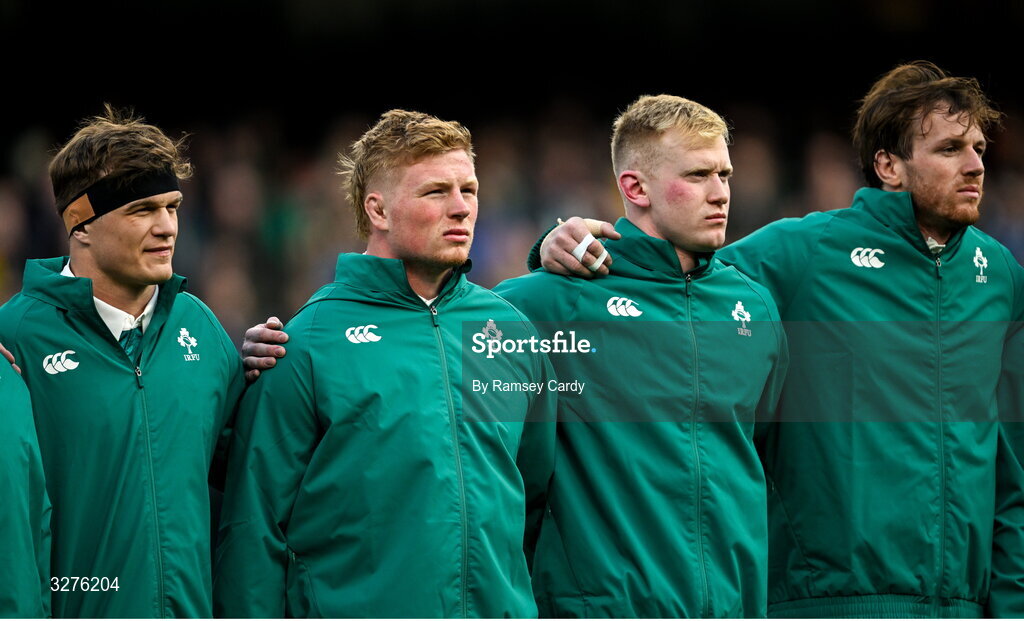1 November 2025; Ireland players, from left, Josh van der Flier, Paddy McCarthy, Jamie Osborne and Ryan Baird before the Gallagher Cup match between Ireland and New Zealand at Soldier Field in Chicago, USA. Photo by Ramsey Cardy/Sportsfile