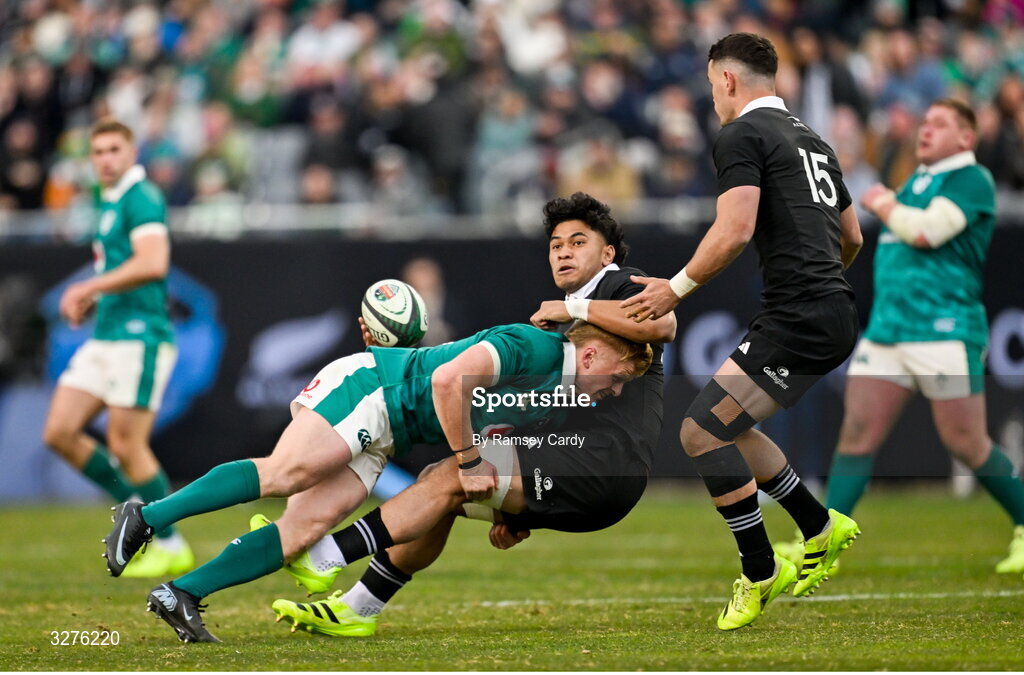 1 November 2025; Tommy O'Brien of Ireland in action against Wallace Sititi of New Zealand during the Gallagher Cup match between Ireland and New Zealand at Soldier Field in Chicago, USA. Photo by Ramsey Cardy/Sportsfile