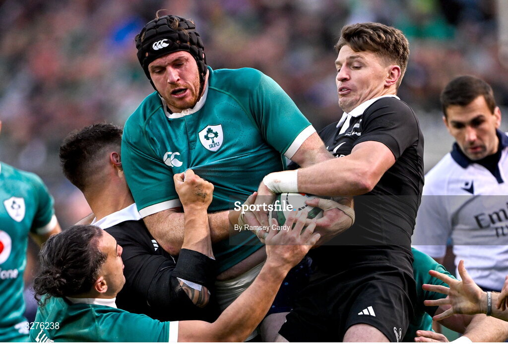 1 November 2025; Ryan Baird of Ireland is tackled by Quinn Tupaea, left, and Beauden Barrett of New Zealand during the Gallagher Cup match between Ireland and New Zealand at Soldier Field in Chicago, USA. Photo by Ramsey Cardy/Sportsfile