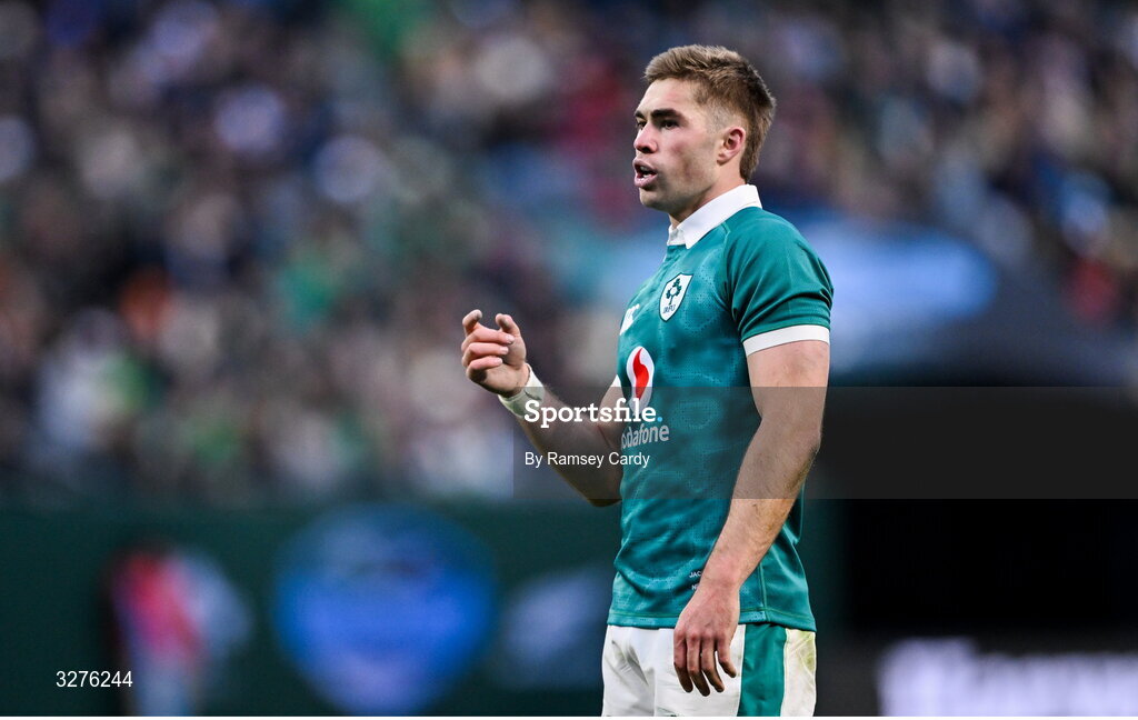 1 November 2025; Jack Crowley of Ireland during the Gallagher Cup match between Ireland and New Zealand at Soldier Field in Chicago, USA. Photo by Ramsey Cardy/Sportsfile