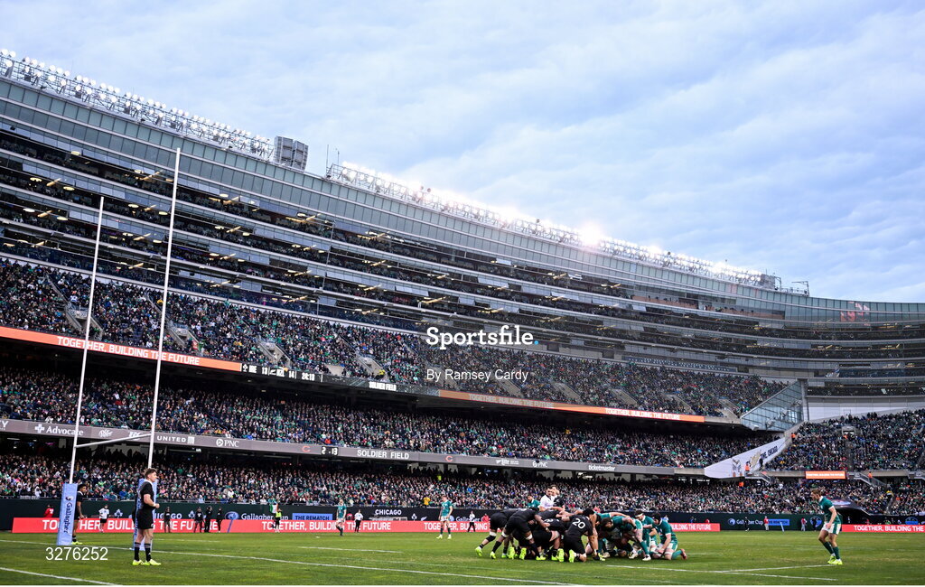 1 November 2025; A general view of a scrum during the Gallagher Cup match between Ireland and New Zealand at Soldier Field in Chicago, USA. Photo by Ramsey Cardy/Sportsfile