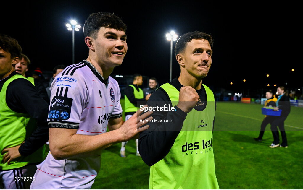 1 November 2025; Keith Buckley, right, and James Clarke of Bohemians celebrate after the SSE Airtricity Men's Premier Division match between Drogheda United and Bohemians at Sullivan & Lambe Park in Drogheda, Louth. Photo by Ben McShane/Sportsfile