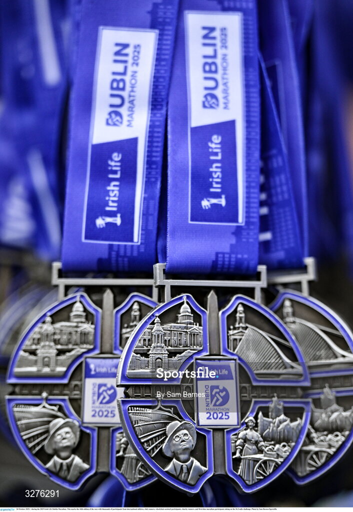 26 October 2025; A general view of the medals during the 2025 Irish Life Dublin Marathon. This marks the 44th edition of the race with thousands of participants from international athletes, club runners, wheelchair-assisted participants, charity runners, and first-time marathon participants taking on the 26.2-mile challenge. Photo by Sam Barnes/Sportsfile