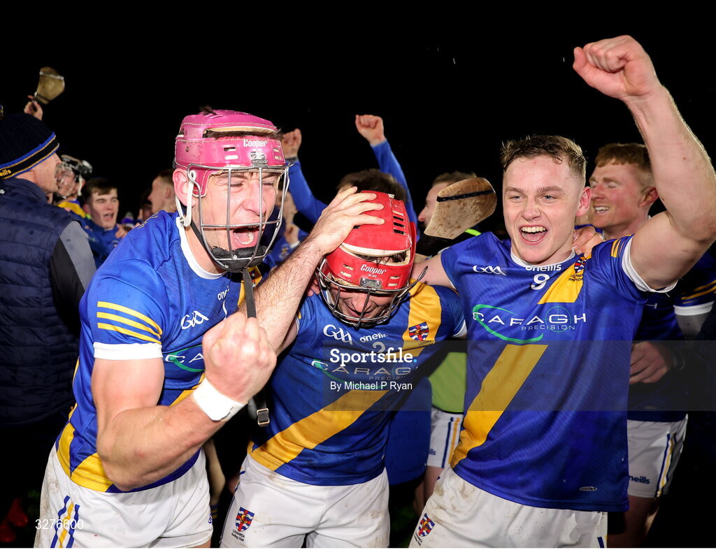 1 November 2025; Loughrea players, from left, Joe Mooney, Paul Hoban, and Cullen Killeen celebrate at full time during the Galway County Senior Club Hurling Championship final match between St Thomas' and Loughrea at Pearse Stadium in Galway. Photo by Michael P Ryan/Sportsfile
