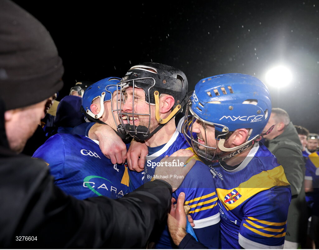 1 November 2025; Loughrea players, from left, Kieran Hanrahan, Neil Keary, and Johnny Coen celebrate at full time during the Galway County Senior Club Hurling Championship final match between St Thomas' and Loughrea at Pearse Stadium in Galway. Photo by Michael P Ryan/Sportsfile