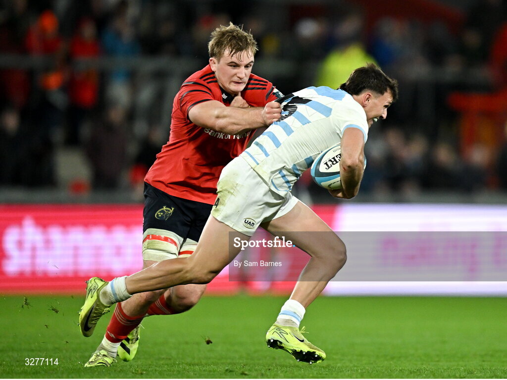 1 November 2025; Tobias Wade of Argentina XV is tackled by Gavin Coombes of Munster during the tour match between Munster and Argentina XV at Thomond Park in Limerick. Photo by Sam Barnes/Sportsfile