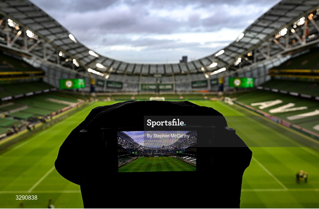13 November 2025; A general view of the Aviva Stadium and a broadcast television camera before the FIFA World Cup 2026 Group F Qualifier match between Republic of Ireland and Portugal at the Aviva Stadium in Dublin. Photo by Stephen McCarthy/Sportsfile