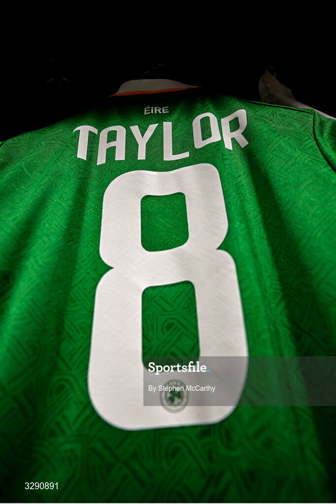 13 November 2025; The jersey of Jack Taylor in the Republic of Ireland dressing room before the FIFA World Cup 2026 Group F Qualifier match between Republic of Ireland and Portugal at the Aviva Stadium in Dublin. Photo by Stephen McCarthy/Sportsfile