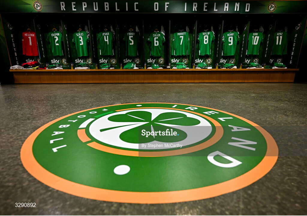 13 November 2025; A general view inside the Republic of Ireland dressing room before the FIFA World Cup 2026 Group F Qualifier match between Republic of Ireland and Portugal at the Aviva Stadium in Dublin. Photo by Stephen McCarthy/Sportsfile