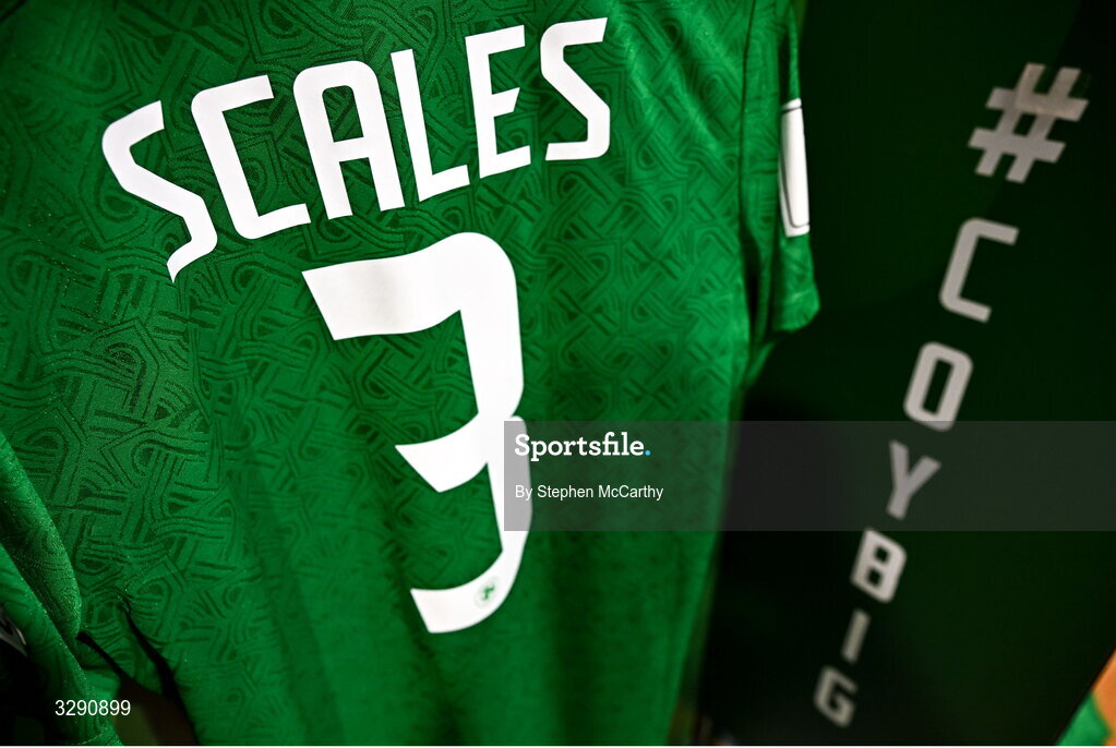 13 November 2025; A general view of the jersey of Liam Scales in the Republic of Ireland dressing room before the FIFA World Cup 2026 Group F Qualifier match between Republic of Ireland and Portugal at the Aviva Stadium in Dublin. Photo by Stephen McCarthy/Sportsfile