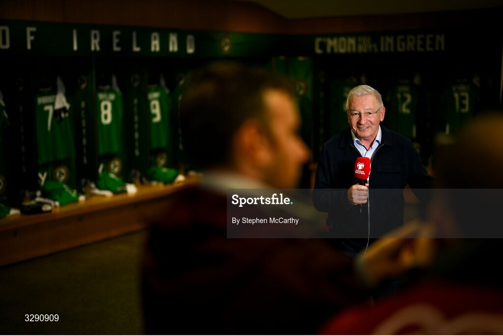 13 November 2025; Broadcaster Tony O'Donoghue recording a piece for RTÉ Sport in the Republic of Ireland dressing room before the FIFA World Cup 2026 Group F Qualifier match between Republic of Ireland and Portugal at the Aviva Stadium in Dublin. Photo by Stephen McCarthy/Sportsfile