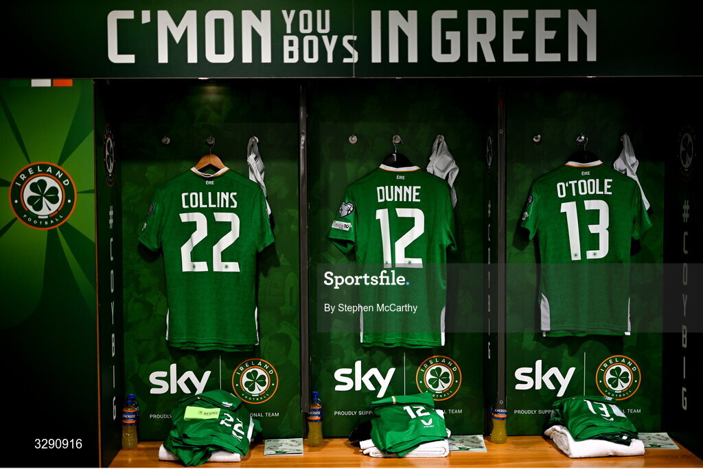 13 November 2025; The jerseys of Nathan Collins, Jimmy Dunne and Kevin O'Toole in the Republic of Ireland dressing room before the FIFA World Cup 2026 Group F Qualifier match between Republic of Ireland and Portugal at the Aviva Stadium in Dublin. Photo by Stephen McCarthy/Sportsfile