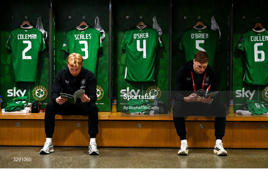 13 November 2025; Liam Scales, left, and Jake O'Brien of Republic of Ireland in the dressingroom before the FIFA World Cup 2026 Group F Qualifier match between Republic of Ireland and Portugal at the Aviva Stadium in Dublin. Photo by Stephen McCarthy/Sportsfile