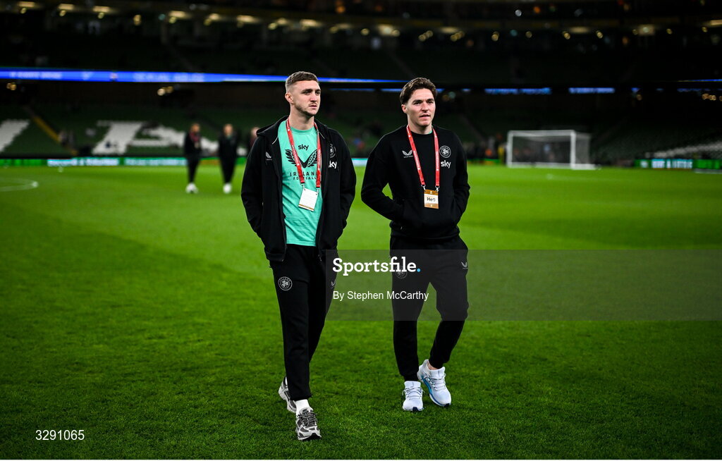 13 November 2025; Jack Taylor, left, and Conor Coventry of Republic of Ireland walk the pitch before the FIFA World Cup 2026 Group F Qualifier match between Republic of Ireland and Portugal at the Aviva Stadium in Dublin. Photo by Stephen McCarthy/Sportsfile