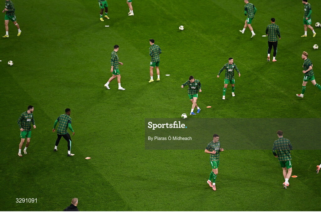 13 November 2025; The Republic of Ireland team warm up before the FIFA World Cup 2026 Group F Qualifier match between Republic of Ireland and Portugal at the Aviva Stadium in Dublin. Photo by Piaras Ó Mídheach/Sportsfile