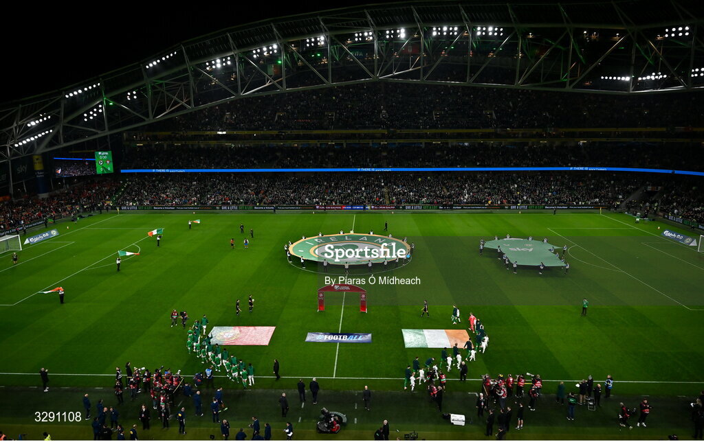 13 November 2025; The Republic of Ireland and Portugal teams make their way onto the pitch before the FIFA World Cup 2026 Group F Qualifier match between Republic of Ireland and Portugal at the Aviva Stadium in Dublin. Photo by Piaras Ó Mídheach/Sportsfile