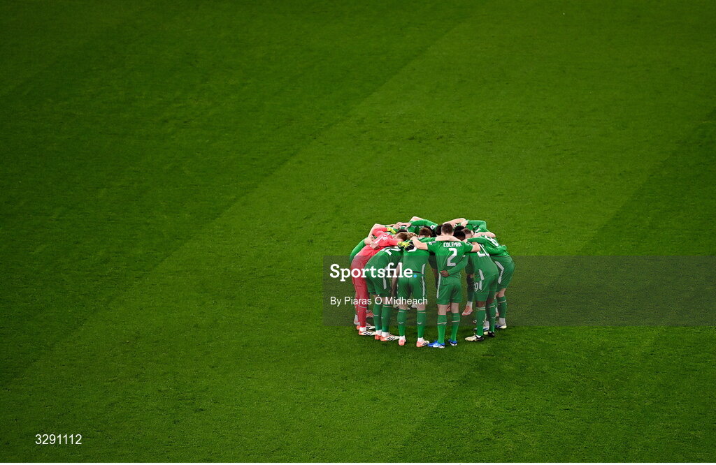 13 November 2025; The Republic of Ireland team huddle before the FIFA World Cup 2026 Group F Qualifier match between Republic of Ireland and Portugal at the Aviva Stadium in Dublin. Photo by Piaras Ó Mídheach/Sportsfile