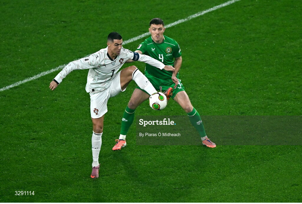 13 November 2025; Cristiano Ronaldo of Portugal in action against Dara O'Shea of Republic of Ireland during the FIFA World Cup 2026 Group F Qualifier match between Republic of Ireland and Portugal at the Aviva Stadium in Dublin. Photo by Piaras Ó Mídheach/Sportsfile