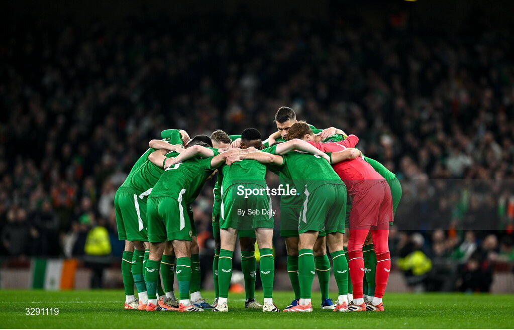 13 November 2025; The Republic of Ireland team huddle before the FIFA World Cup 2026 Qualifier match between Republic of Ireland and Portugal at the Aviva Stadium in Dublin. Photo by Seb Daly/Sportsfile