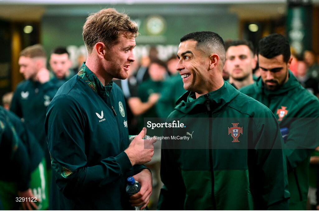 13 November 2025; Nathan Collins of Republic of Ireland, left, and Cristiano Ronaldo of Portugal before the FIFA World Cup 2026 Group F Qualifier match between Republic of Ireland and Portugal at the Aviva Stadium in Dublin. Photo by Stephen McCarthy/Sportsfile