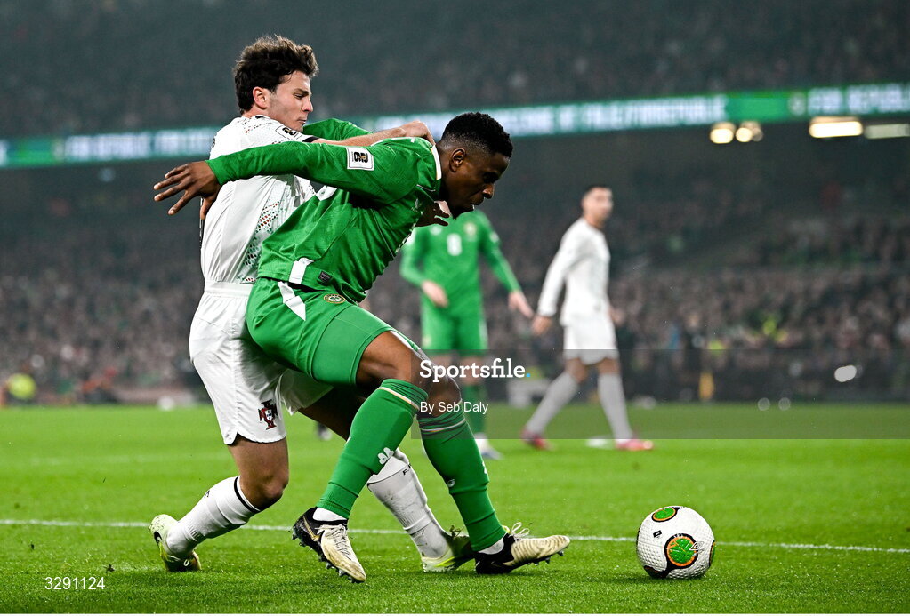 13 November 2025; Chiedozie Ogbene of Republic of Ireland in action against Joao Neves of Portugal during the FIFA World Cup 2026 Qualifier match between Republic of Ireland and Portugal at the Aviva Stadium in Dublin. Photo by Seb Daly/Sportsfile