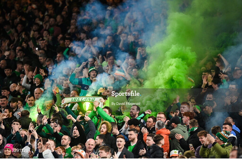 13 November 2025; Republic of Ireland supporters during the FIFA World Cup 2026 Group F Qualifier match between Republic of Ireland and Portugal at the Aviva Stadium in Dublin. Photo by David Fitzgerald/Sportsfile