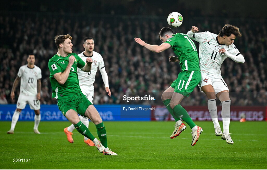 13 November 2025; Finn Azaz of Republic of Ireland in action against Joao Félix of Portugal during the FIFA World Cup 2026 Group F Qualifier match between Republic of Ireland and Portugal at the Aviva Stadium in Dublin. Photo by David Fitzgerald/Sportsfile