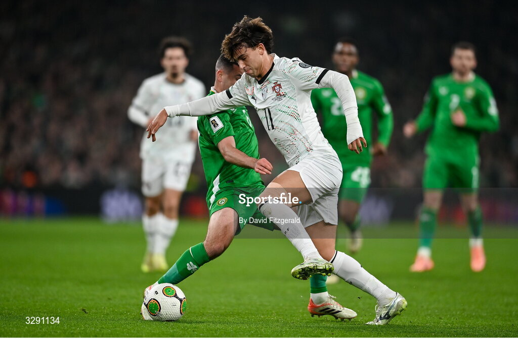 13 November 2025; Joao Félix of Portugal in action against Josh Cullen of Republic of Ireland during the FIFA World Cup 2026 Group F Qualifier match between Republic of Ireland and Portugal at the Aviva Stadium in Dublin. Photo by David Fitzgerald/Sportsfile